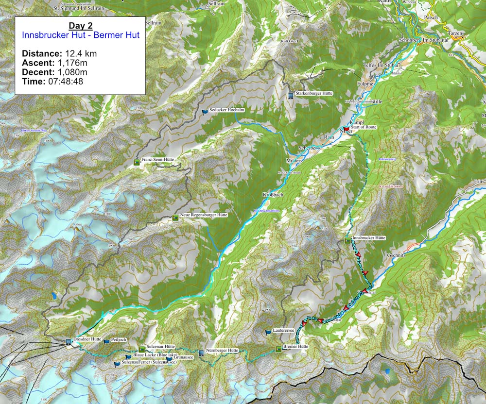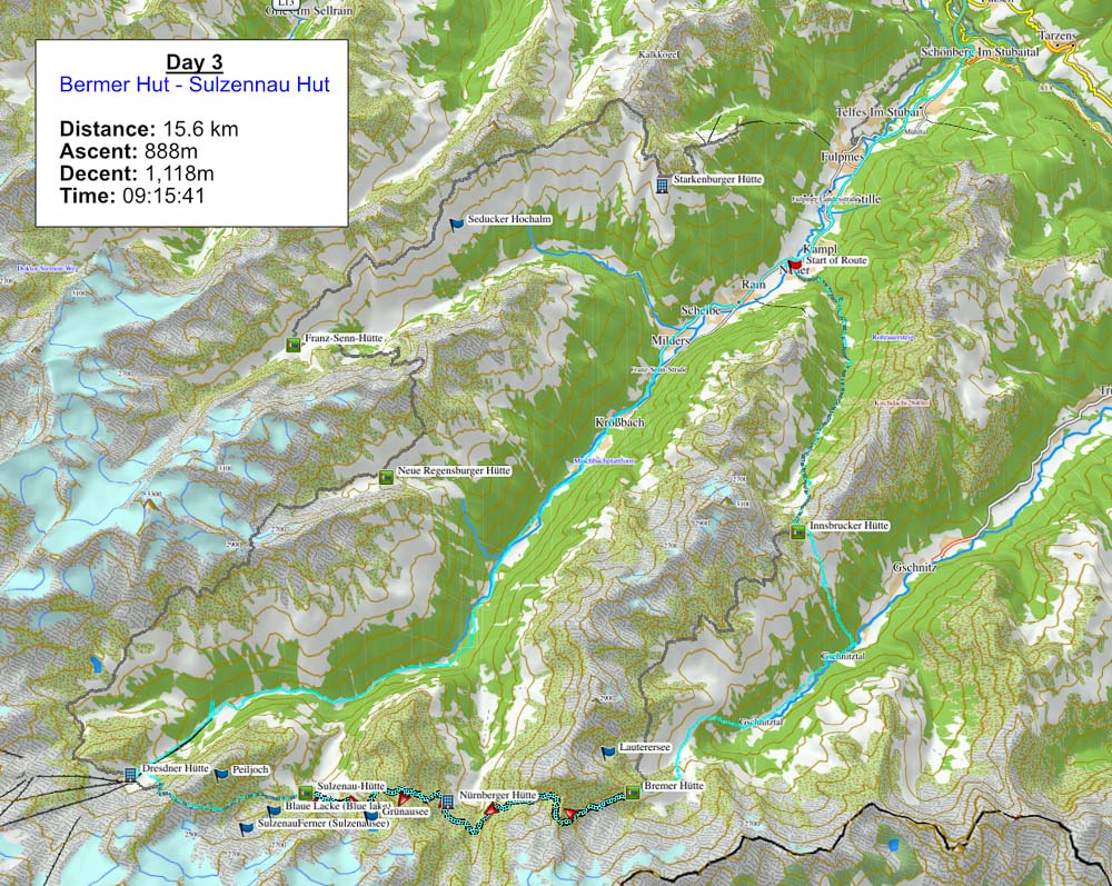 היום השלישי הכיל את מקטעים 3 ו-4 של המסלול המקורי וכלל את ההליכה מבקתת Bermer דרך בקתת Nurberger לבקתת Sulzenau אורך: 10.4 ק״מ, טיפוס 882 מ׳, ירידה 1,103 מ׳ 8 שעות הליכה.