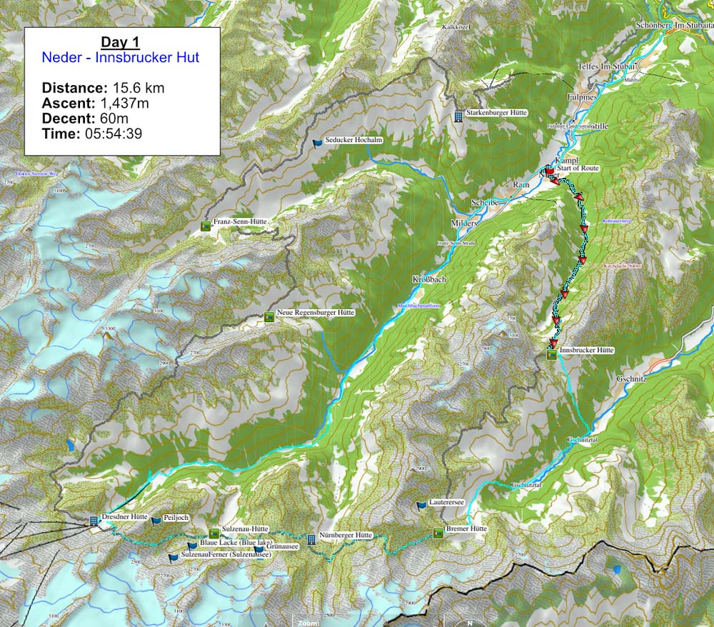 היום הראשון תוכנן לפי הספר וכלל את העליה מהיישוב Neder לבקתת Insbrucker אורך: 11 ק״מ, טיפוס 1,391 מ׳ , 5 שעות הליכה.