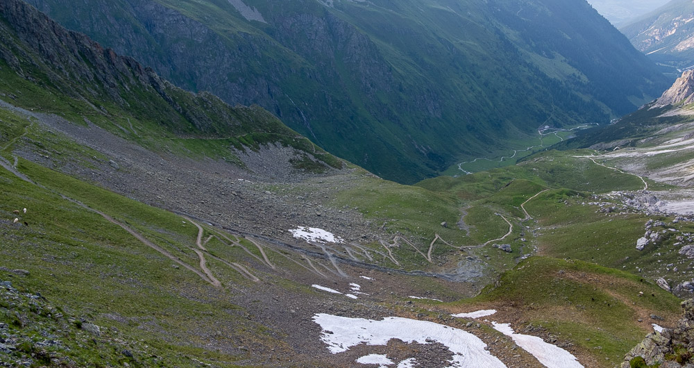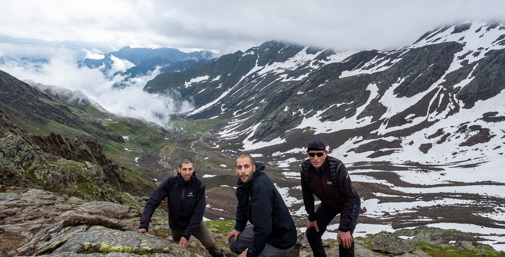 ממשיכים ללכת ומגיעים לעמק גדול. מנחשים לאיפה השביל שאנו נמצאים עליו יוביל אותנו. לאחר כשעת הליכה לא פשוטה, השביל פונה ימינה למעבר ההרים. הטיפוס תלול מאוד, כולו מלא סלעים ודרדרת. לשמחתנו המסלול מתוחזק ובמקטעים הקשים ישנם חבלי מתכת אשר ניתן לטפס לאורכם. הטיפוס אינו ארוך אך עצים. זה המקום להזכיר שיצאנו ממקום שנמצא בגובה 2.6 ק״מ ומשם המשכנו לטפס. אני מגיע ראשון לשיא גובה ומספיק לצלם את אבא ועמית לקראת סוף העליה.
