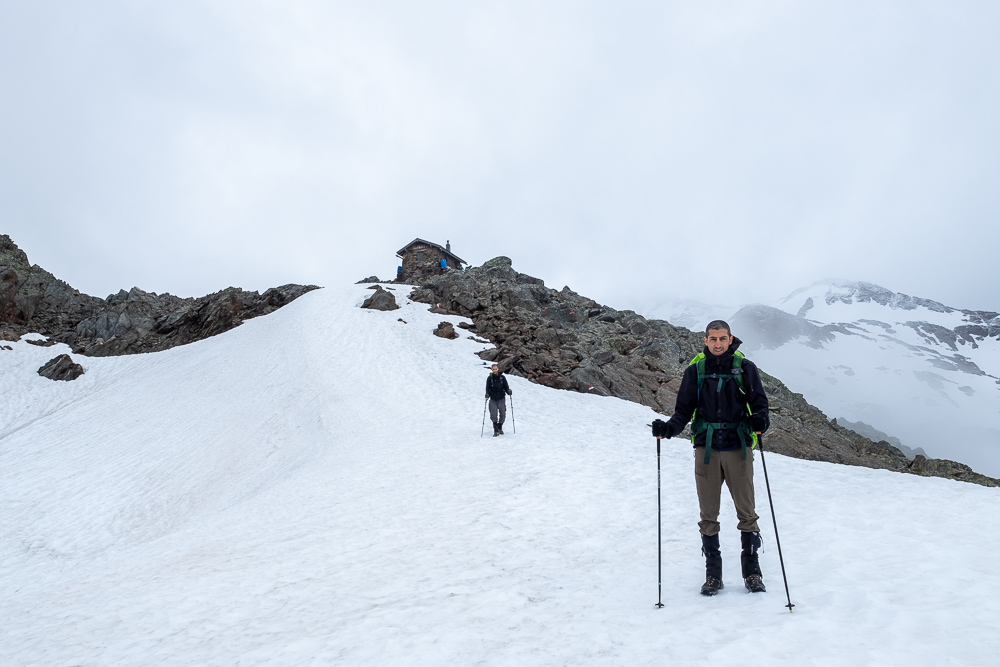 עמית נגמר לגמרי אבל אנחנו לא עושים עצירות במטרה להשיג את מזג האוויר. לאט לאט מתחילים לחלוף על משטחי שלג ומבינים שאנו נמצאים כבר בגובה משמעותי ושהבקתה בוודאי לא רחוקה. ממשכים ללכת עוד זמן לא מבוטל וסופסוף רואים באופק את הבקתה!