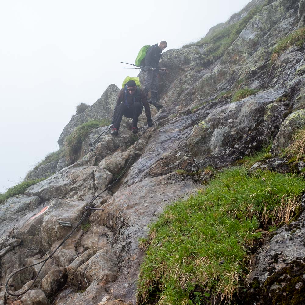 לאחר שכחצי שעה של הליכה בעמק, מתחילים לטפס ותוואי השטח משתבש. באופק רואים על ההר מעין חתיכות מתכת ולא מבינים בשלב זה למה הן מיועדות, מעריכים שזה אולי קשור להגנה ממפולות. ככל שמתקדמים התמונה מתבהרת, אלו משטחי מתכת צרים המיועדים לחציית קטעים בהם אין שביל.
