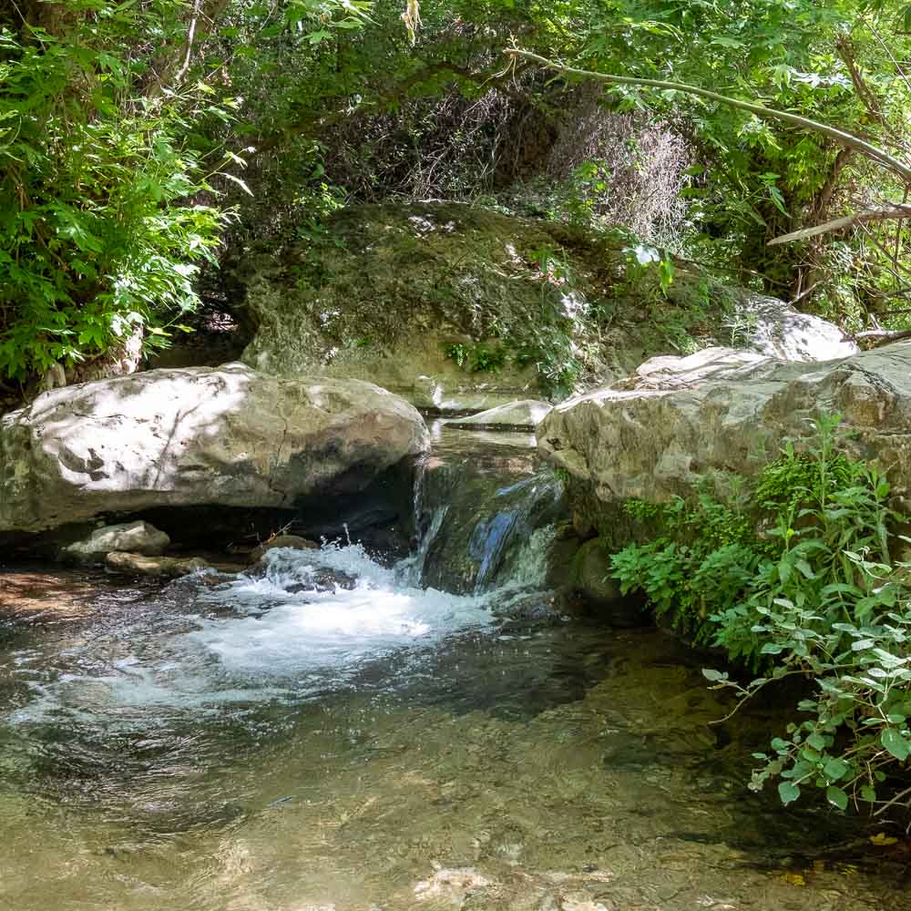 המשכנו ללכת בתוך העמק במקביל לנחל, דרך יפיפיה, שקטה ומאוד פסטורלית. בצד השביל מצאנו נקודת גן עד קטנה ומוצלת למרגלות הנחל ליד מספר מפלונים קטנים ועצרנו שם לארוחת צהריים תו״כ טבילת רגלנו במים הצוננים.