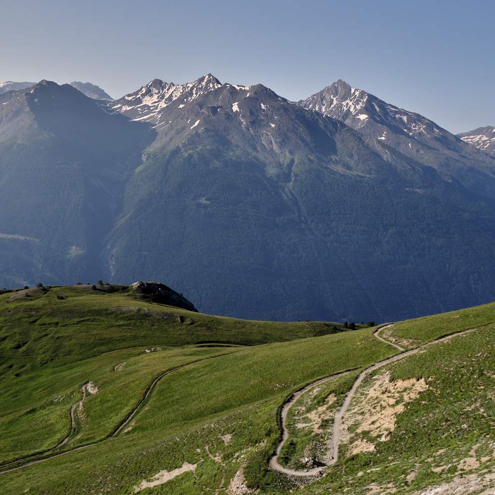 היום התחיל יחסית בשביל נוח, הלכנו מול השמש הזורחת והיה קשה להסתכל לכיוון ההתקדמות. ההליכה הייתה על שביל סינגל חלק ומפותל כשמסביב נוף אלפיני מלא הרים מושלגים.