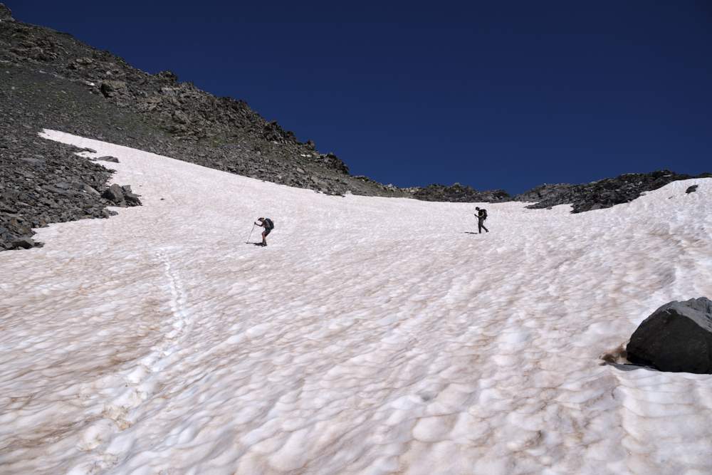 לאחר מנוחה על המעבר וההבנה שסיימנו את הטיפוס המשמעותי האחרון במסלול התחלנו בירידה שהייתה לא פחות טכנית מהעלייה. דווקא בירידה היו משטחי שלג גדולים ועקב השיפוע המשמעותי ההליכה הייתה ב-״סללומים״